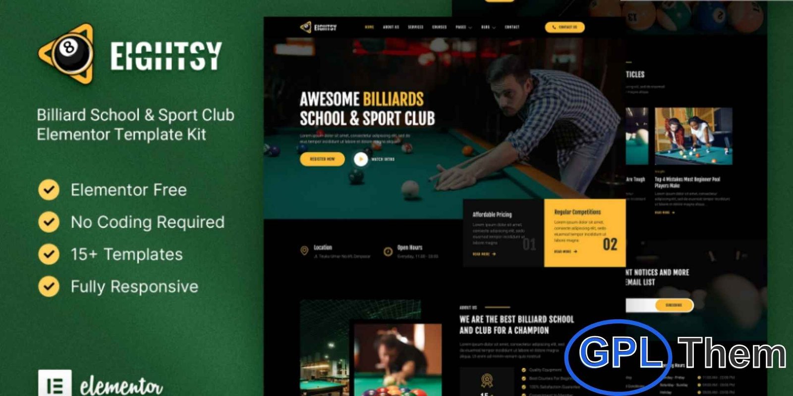 Billierd – Billiard School & Sport Club Elementor Template Kit is a professional and easy-to-use solution for creating websites for billiard schools, sports clubs, and recreational centers. Designed for the Elementor Page Builder plugin for WordPress, this template kit allows you to build a modern, fully functional website quickly without coding. Billierd is not a WordPress theme but provides pre-designed page content for Elementor, making customization simple and efficient. Optimized for the free Hello Elementor theme, it is also compatible with most Elementor-supported themes, ensuring a responsive, high-quality website experience across all devices.