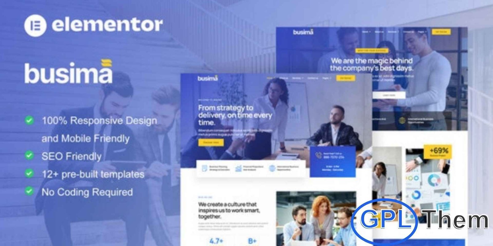 Busima – Business Consultant Elementor Template Kit is a complete Elementor Full Site Kit designed to help businesses and consultants create a professional website quickly and effortlessly. Built for Elementor Pro, Busima delivers a modern, clean, and corporate design that is ideal for business consultants, corporate firms, financial advisors, and professional service providers. The kit includes a fully compatible design system and carefully selected premium-style images, giving your website a strong and consistent brand identity from the start. Optimized for the free Hello Elementor theme, Busima is fast-loading, fully responsive, and performance-focused. With 12+ pre-built templates, this kit makes it easy to launch a polished and high-quality business website without any coding.