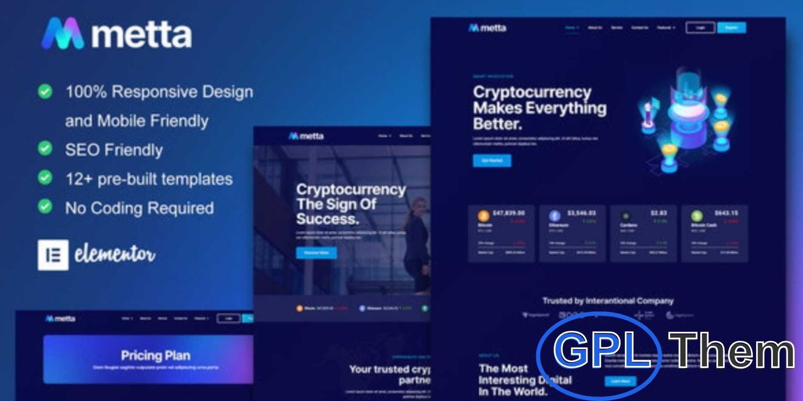 Metta is a modern Elementor Template Kit designed for cryptocurrency, blockchain, bitcoin, and fintech websites. It’s also ideal for technology startups, IT services, and digital businesses. Featuring 12+ pre-built templates, Metta comes with a sleek design and a modern dark-style layout to give your site a professional look. Fully responsive and easy to customize with Elementor, this kit allows you to build a powerful crypto or blockchain website without coding. Optimized for the free Hello Elementor theme, it also works seamlessly with most Elementor-compatible themes.