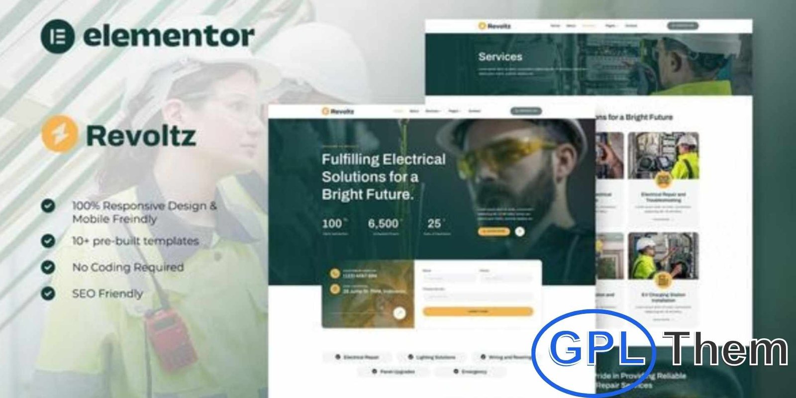 Revoltz is a modern and professional Elementor Template Kit designed for electricians, electrical repair services, and maintenance businesses. Perfect for electrical installation, residential electrical work, home improvement, and other related services, Revoltz helps you showcase your expertise and services online. Featuring a clean, modern, and fully responsive design, this kit is easy to customize using Elementor’s drag-and-drop builder—no coding required—allowing you to build a polished and professional website effortlessly.